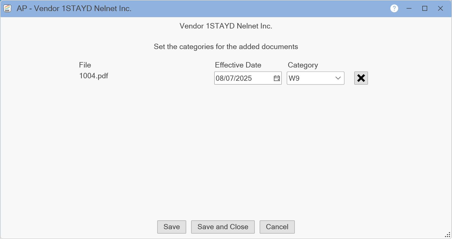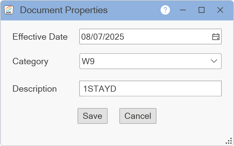 Enter your new Effective Date, select the Category for this document, and enter your new Description. Click Save. You will be returned to the previous window.