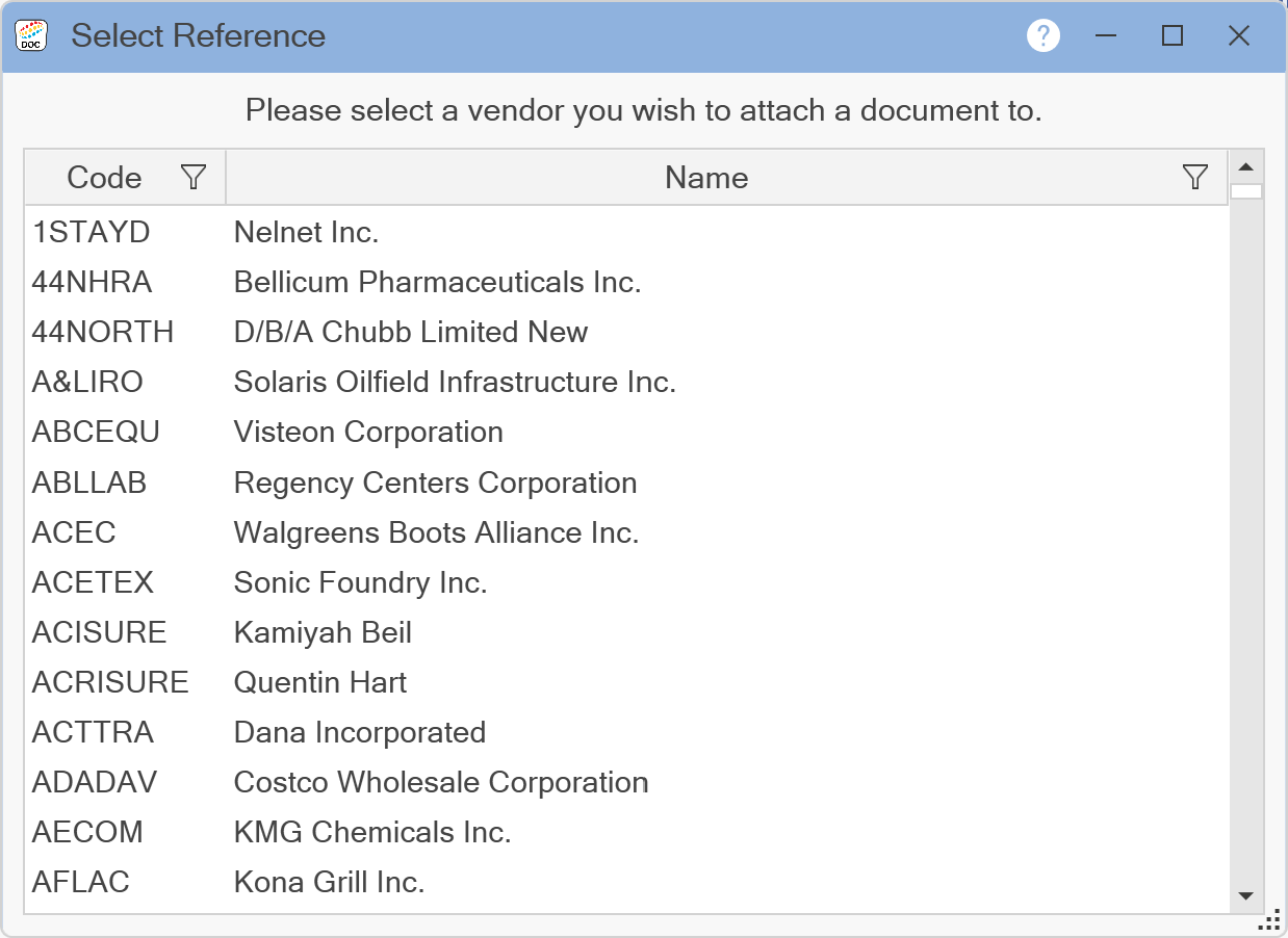 This window lists documents attached to the record from which the window is opened. If opened from a posting, then it will show all documents attached to that transaction. If opened from a maintenance form, then it will show all documents attached to that particular entity, such as a vendor, employee, or equipment. The Documents window is the primary location from which documents are managed. Documents may be added, deleted, and viewed from this window. At the top of the window, the title bar indicates which module the selected record belongs to.
