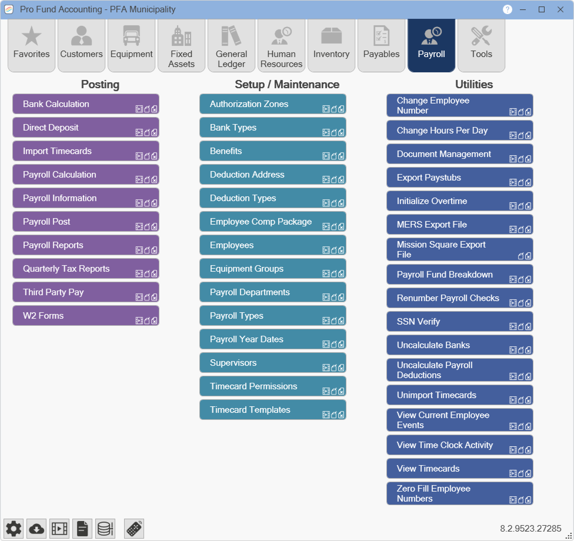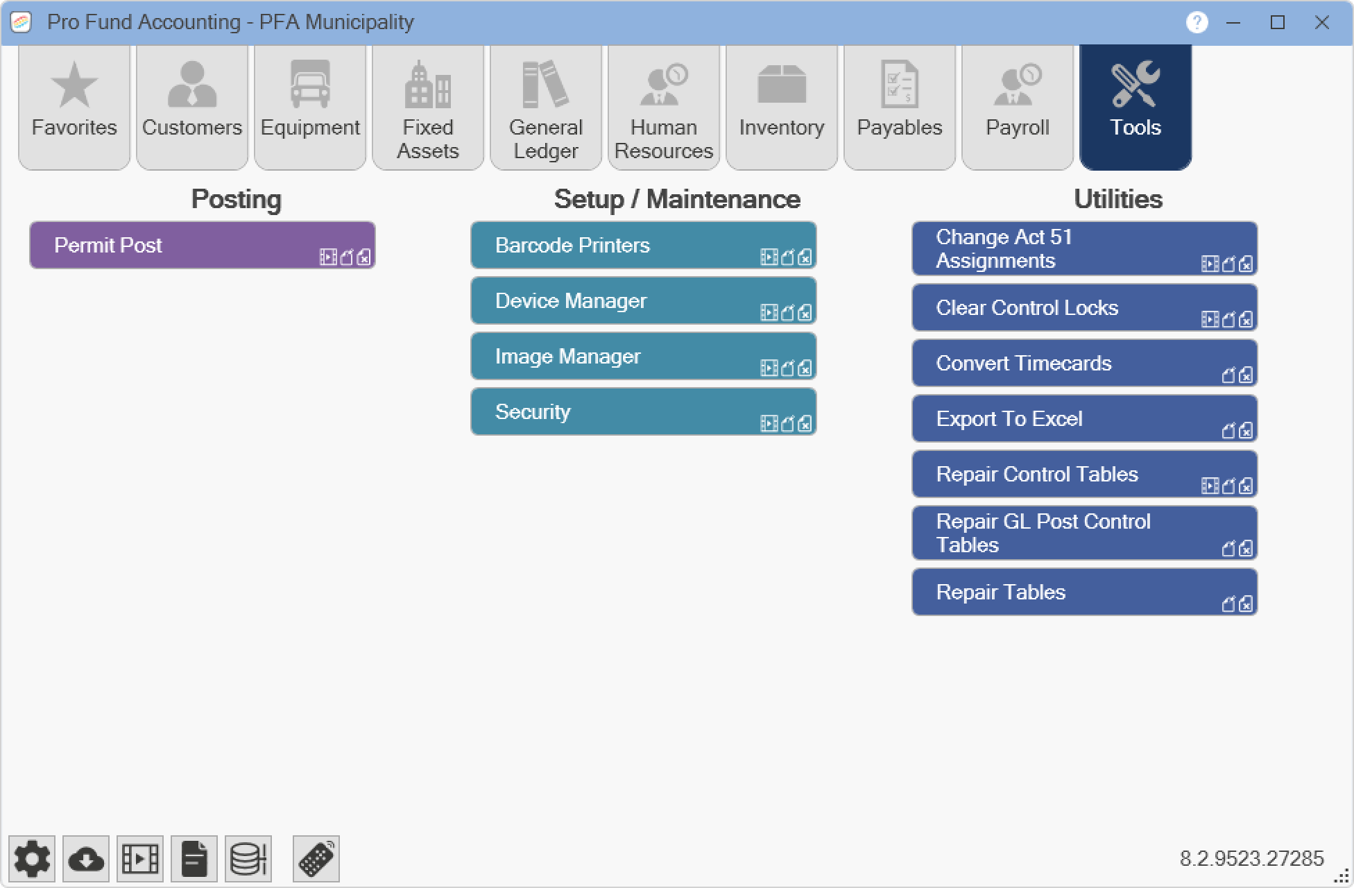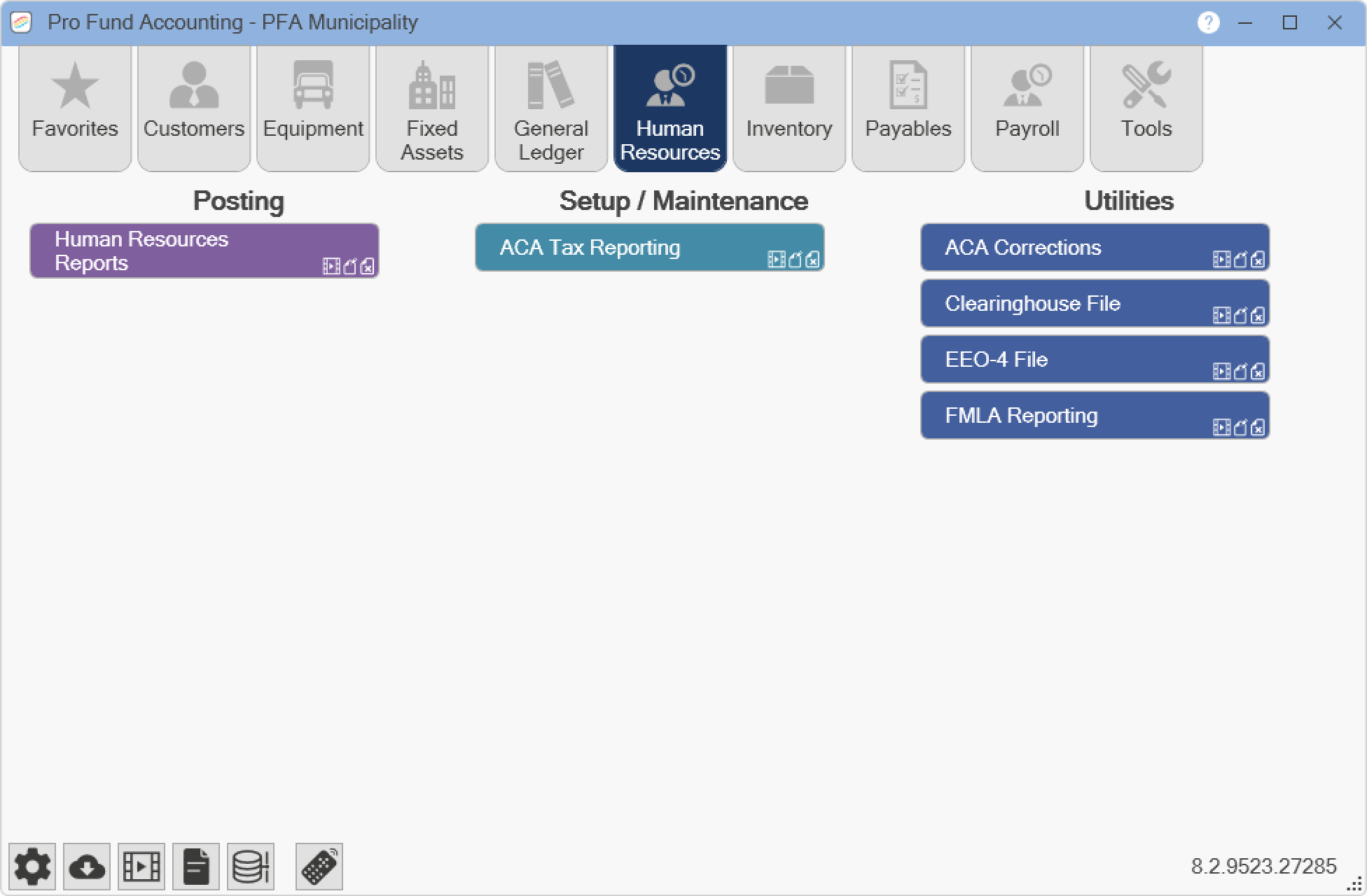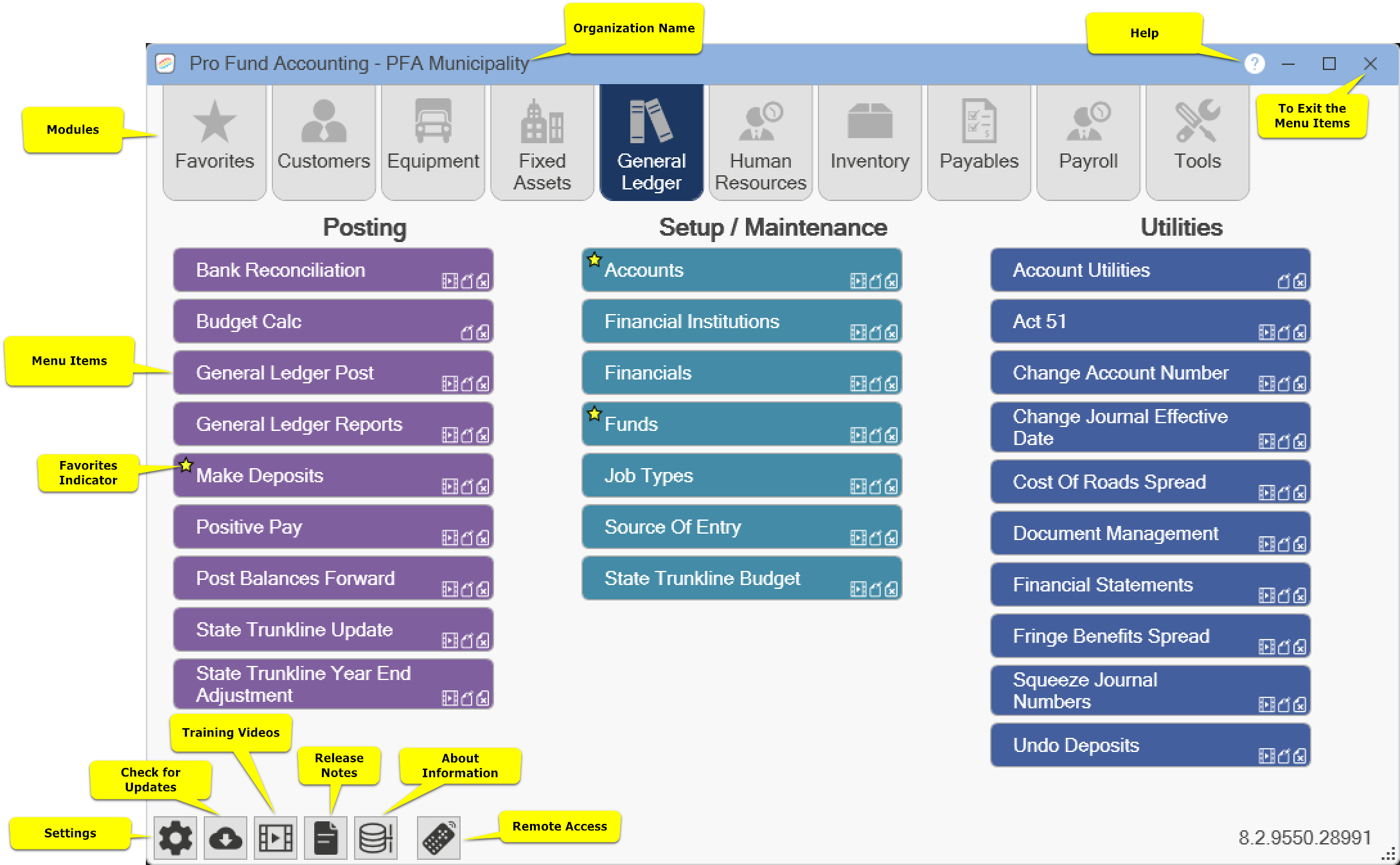 Pro Fund Accounting has many program modules available. NOTE: You will only have access to the modules you have purchased. Also, certain modules may not be seen based on your security settings. The buttons that are used to quickly access the program modules are as follows: Favorites, Customers, Equipment, Fixed Assets, General Ledger, Human Resources, Inventory, Payables, Payroll, and Tools.