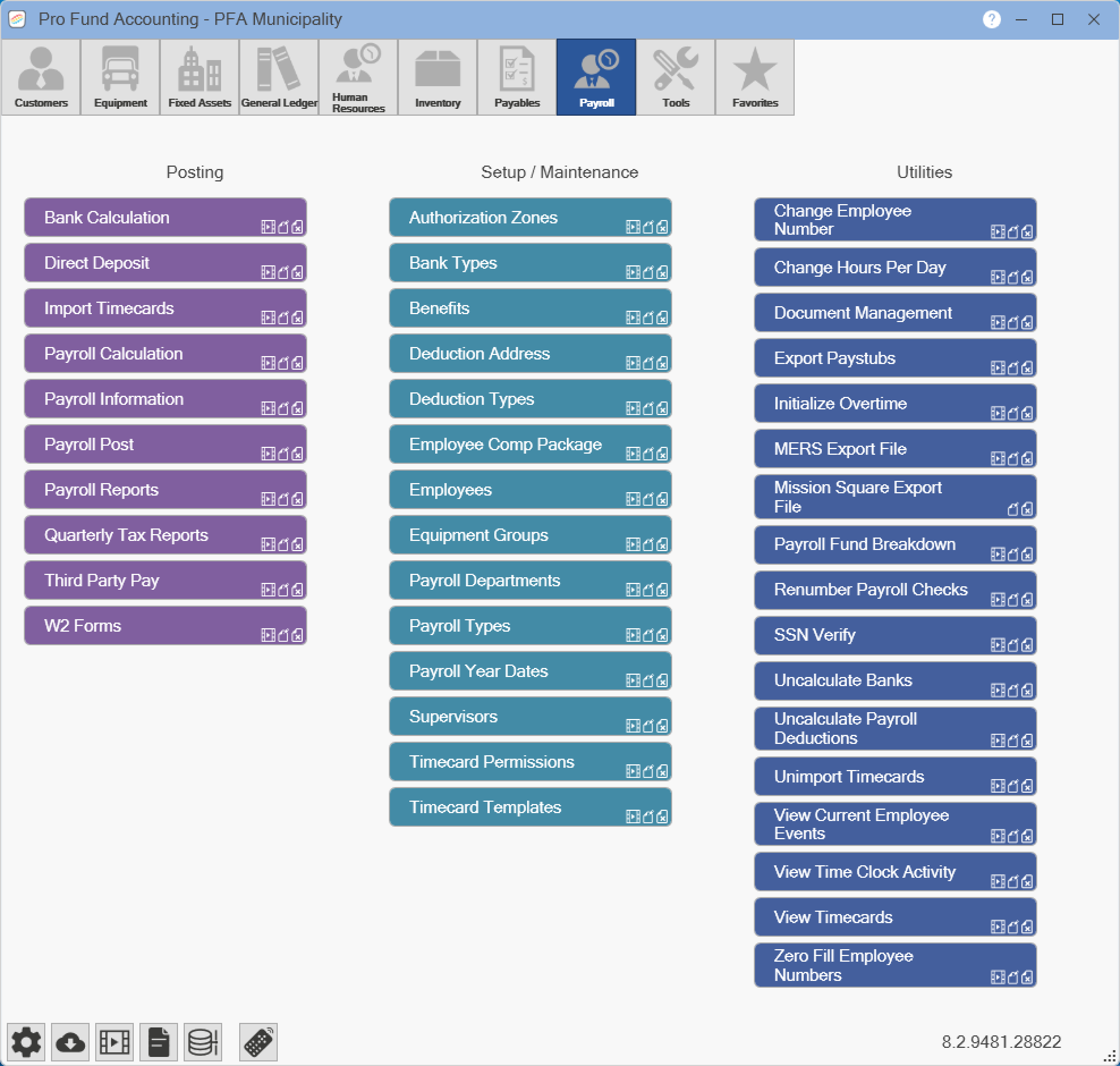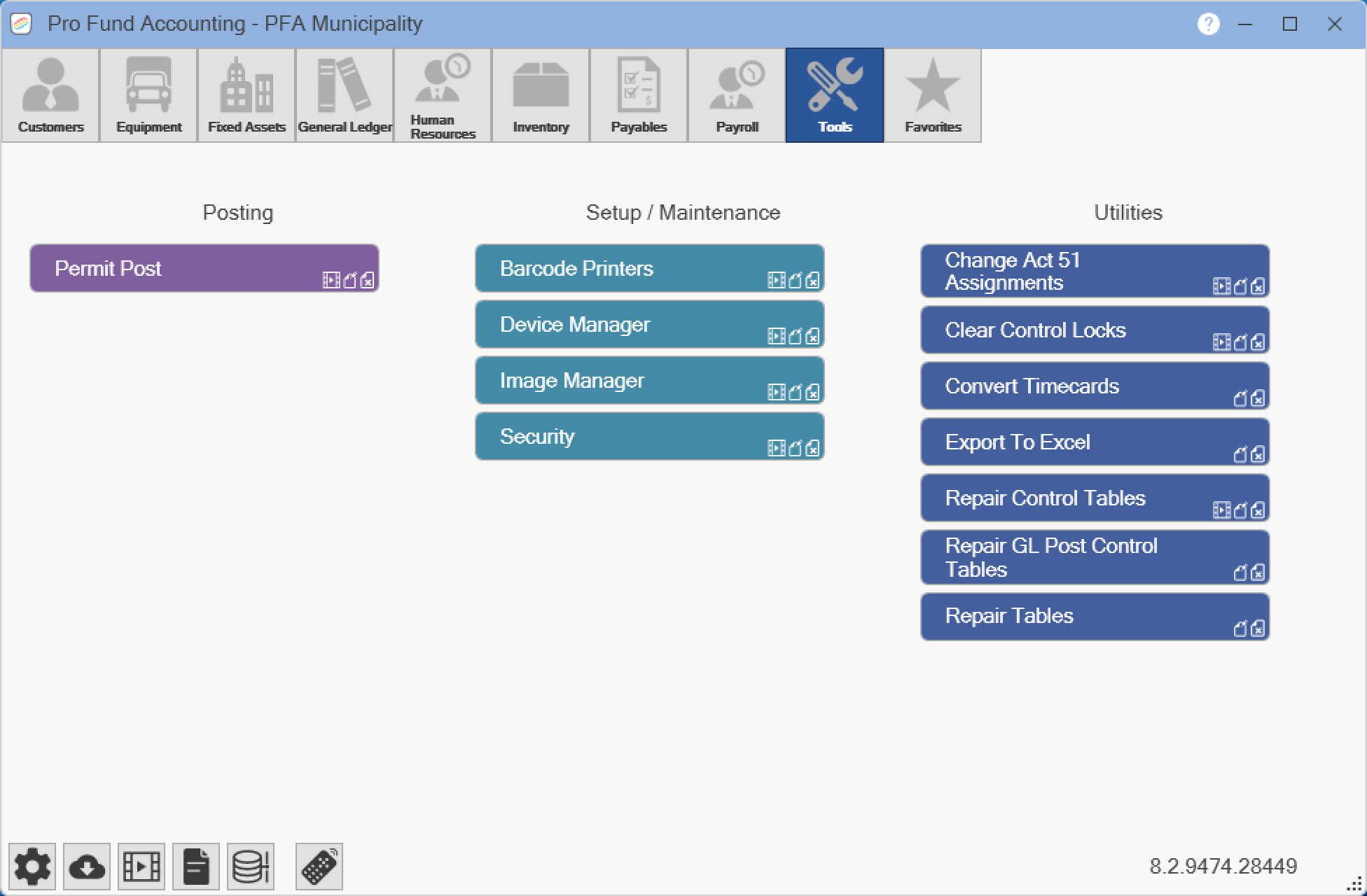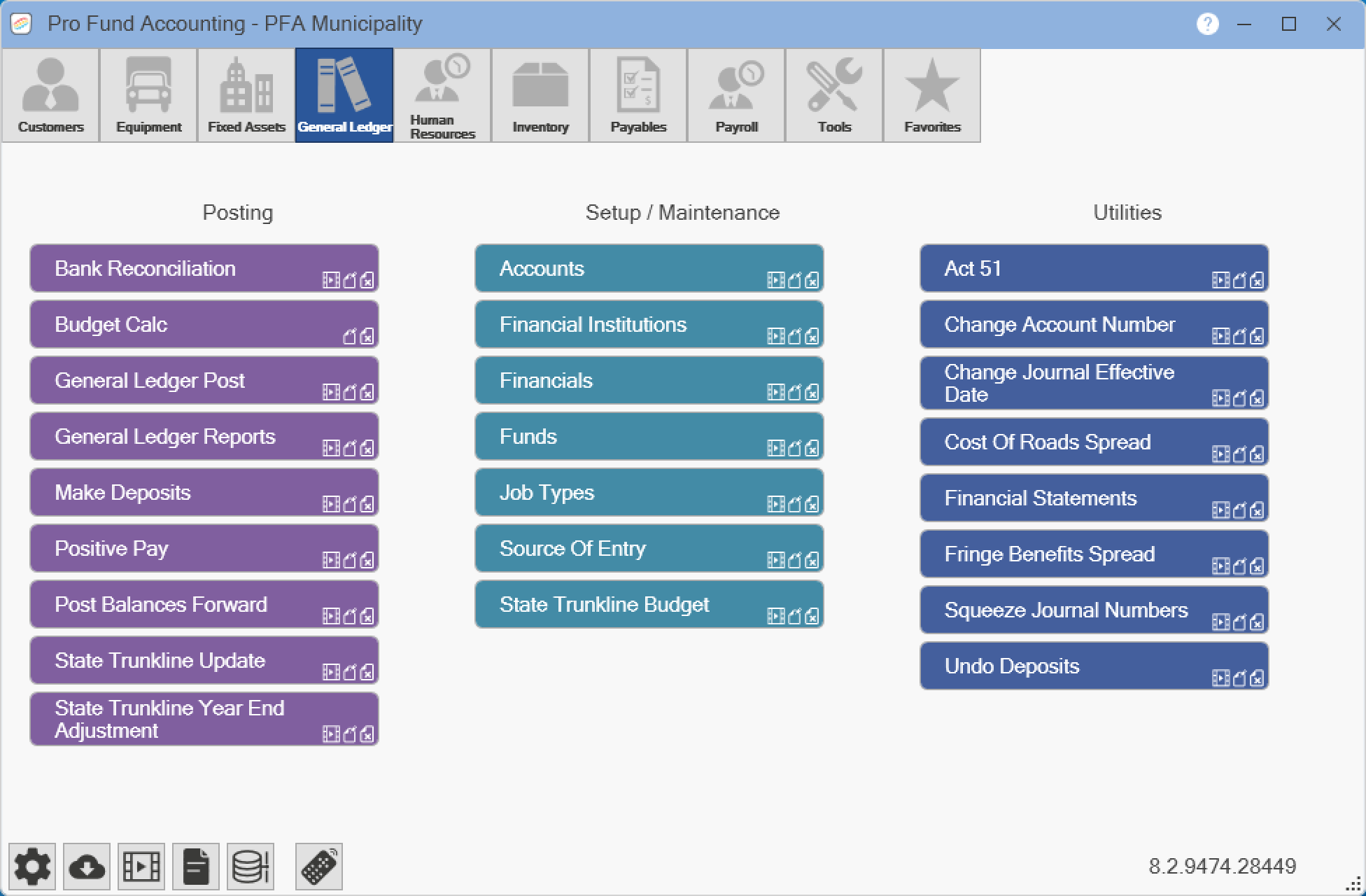 Pro Fund Accounting has many program modules available. NOTE: You will only have access to the modules you have purchased. Also, certain modules may not be seen based on your security settings. The buttons that are used to quickly access the program modules are as follows: Customers, Equipment, Fixed Assets, General Ledger, Human Resources, Inventory, Payables, Payroll, Tools, and Favorites.