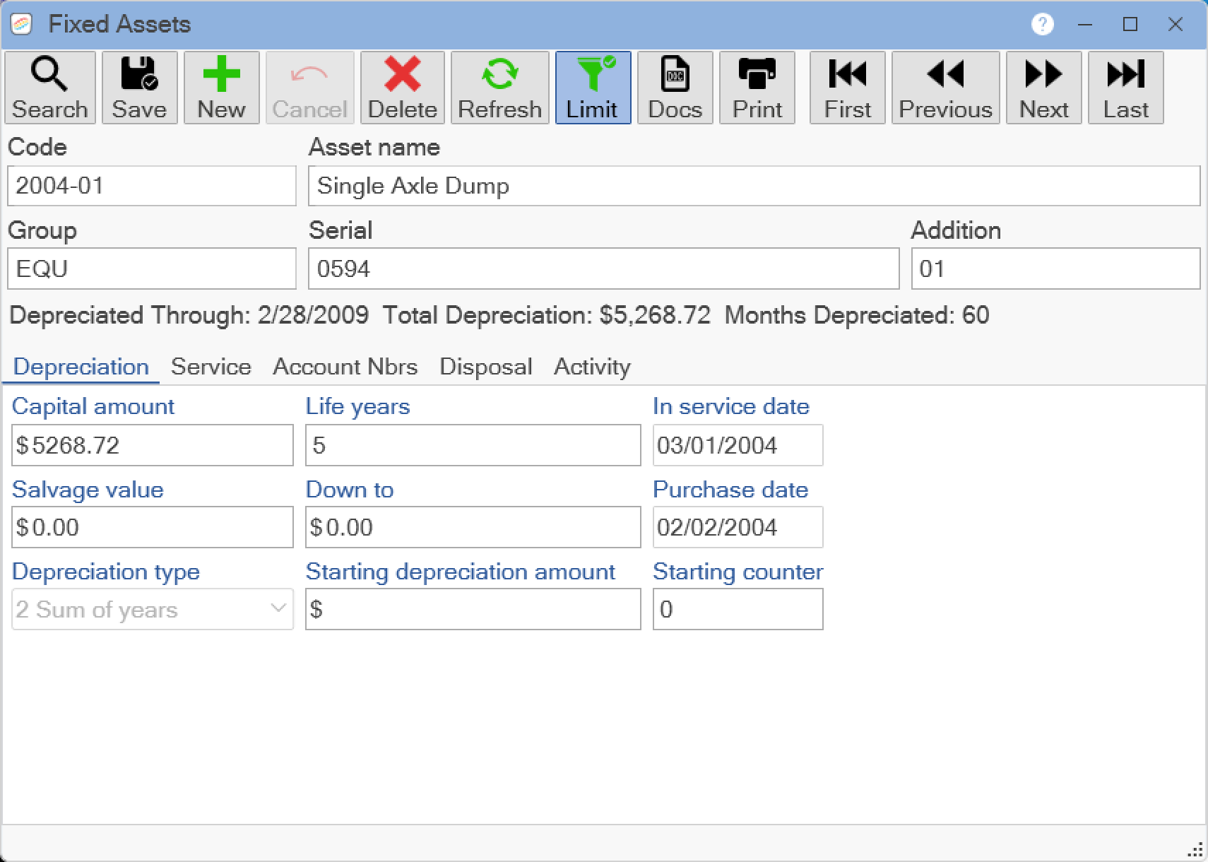 Select the Depreciation Tab to enter or view information about the asset value and the depreciation cycle such as the Capital amount (the total amount paid for the asset; also include Title Fees, etc.), Life years, In service date (the actual date this item is put into service), Salvage value, Down to (If you want to stop depreciating the asset at a certain dollar amount, enter the amount here.), Purchase date, Depreciation type, Starting depreciation amount, Starting counter (The number of months depreciation has been applied to the asset. If the fixed asset is NEW, enter a zero in this field.). NOTE: To keep things in balance, make sure the Capital amount here and the amount in the Equipment menu item Purchase Price ARE THE SAME.