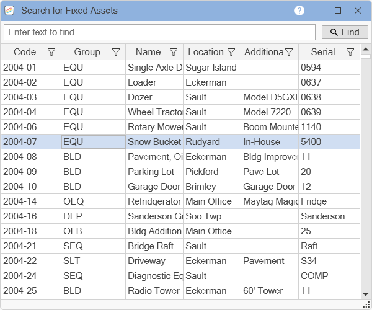 To find information for fixed assets already in Pro Fund Accounting, use the Search for Fixed Assets window. Enter the code or text to find, then click the Find button. You may also locate a fixed asset record by using the Navigation