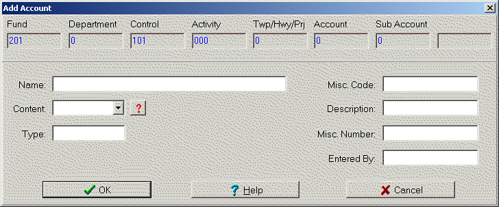 Enter the new account’s Name and Type (Asset, Liability, Expense, Revenue, Equity, etc.). If this is a special purpose account number, select its content type from the Content drop-down list. If this is a State Trunkline account number, enter any Miscellaneous Code, Description, and/or Miscellaneous Number necessary to finish setting up the new account.