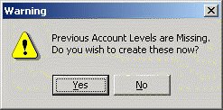 If the account number you’re setting is missing its beginning segments, you’ll be warned that the new account number is missing its previous levels and asked if you want to set them up. Click YES to do so. If you click NO, you’ll be informed that the missing levels must first be set up in order to enter the new account number.