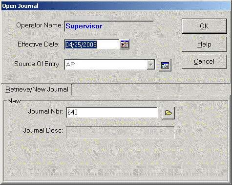 Each of the posting programs in Highway Management requires information to be filled in on an "Open Journal" screen. This information identifies various information about the transactions being posted including source of entry, effective date, journal number and journal description.