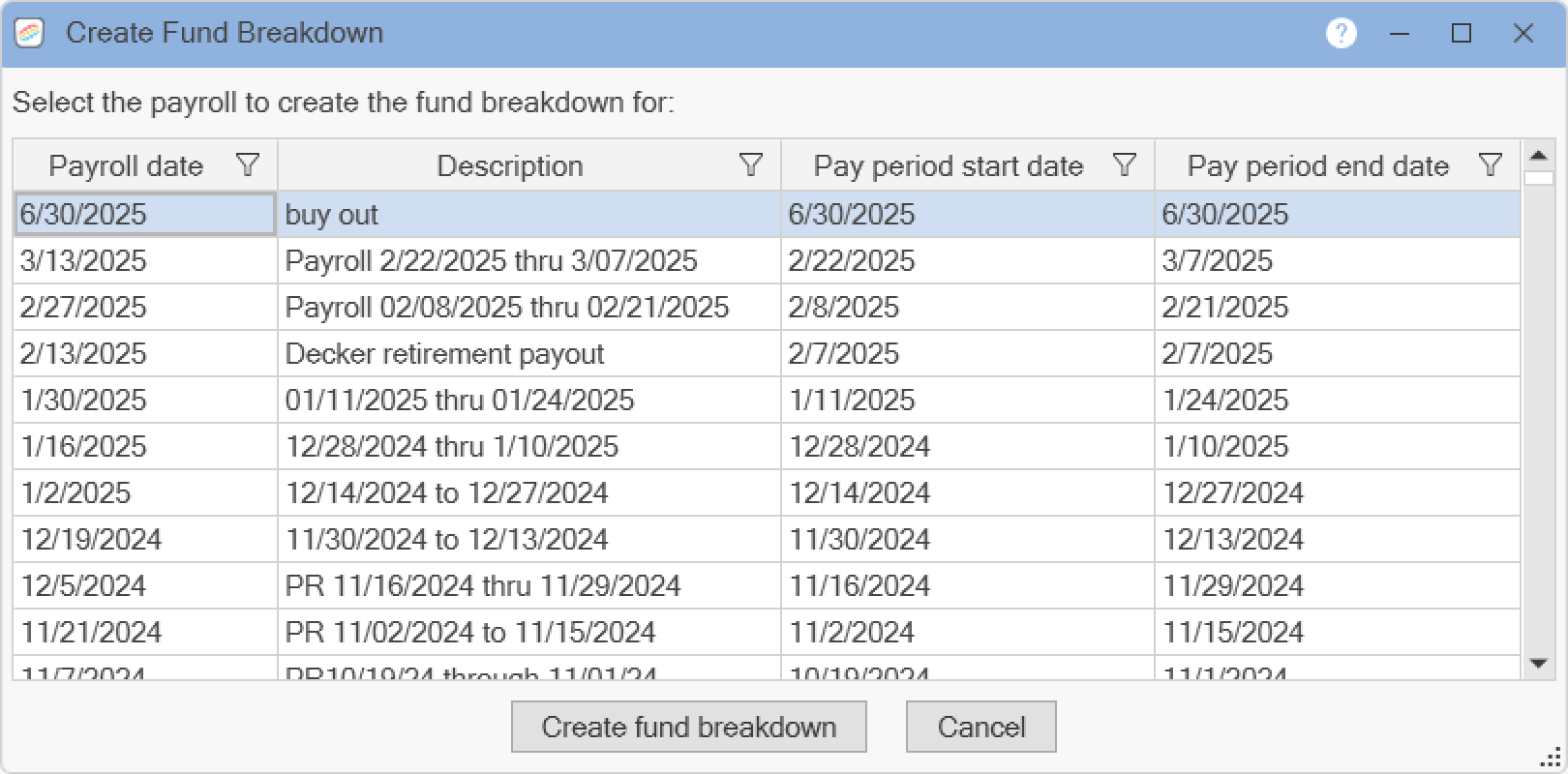 Select the payroll you wish to create the fund breakdown for by clicking anywhere on the entry line. Click the Create Fund Breakdown button.